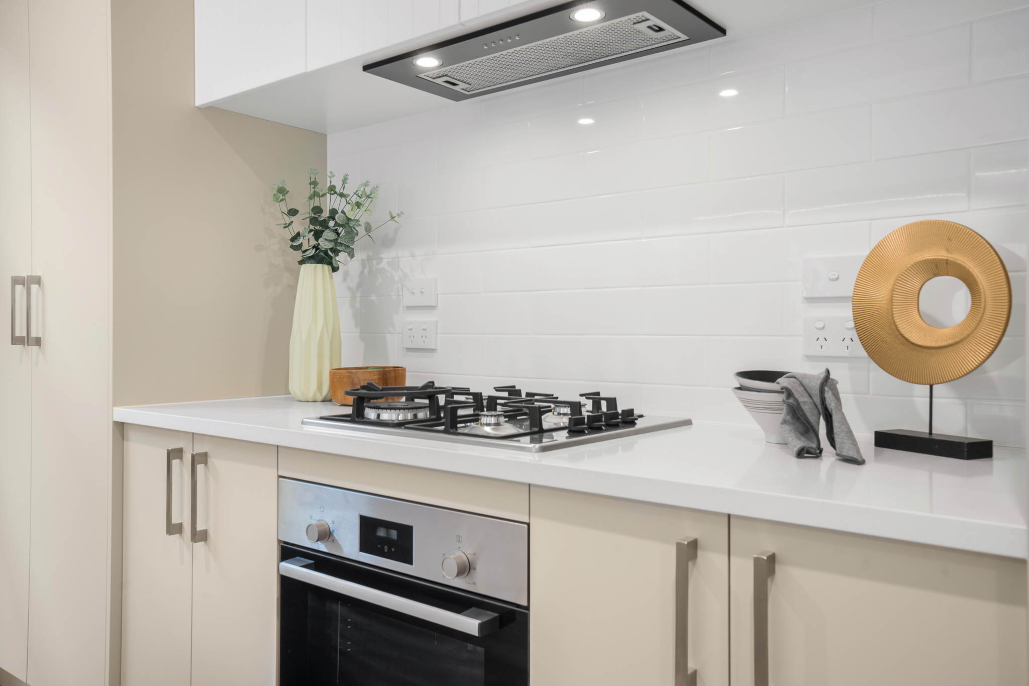 -Modern Kitchen: Stone benchtops, gas hob, oven, dishwasher, and rangehood, contemporary cabinetry with excellent storage