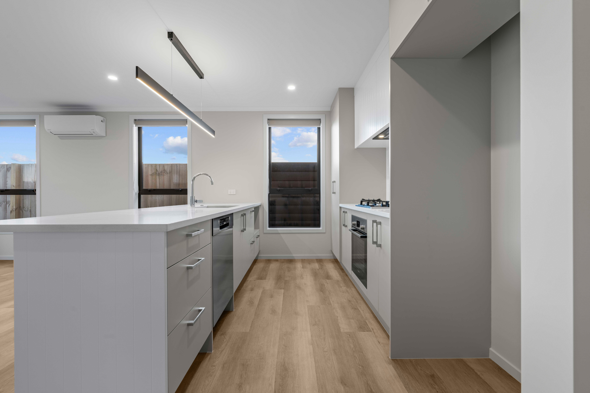 Includes a gas hob, stone benchtops, dishwasher, oven, rangehood, and plenty of storage.
